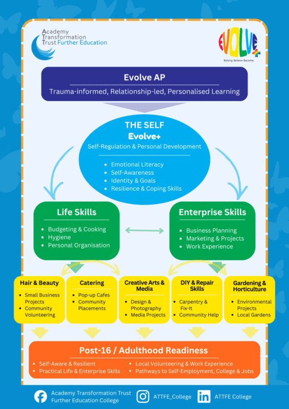At EVOLVE Alternative Provision, we support young people who need a different approach to education. Our nurturing, trauma-informed environment helps learners rebuild confidence, develop life skills, and achieve meaningful progress both academically and personally. EVOLVE is an inclusive learning space which provides a natural sense of belonging.