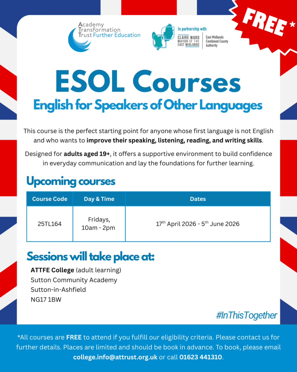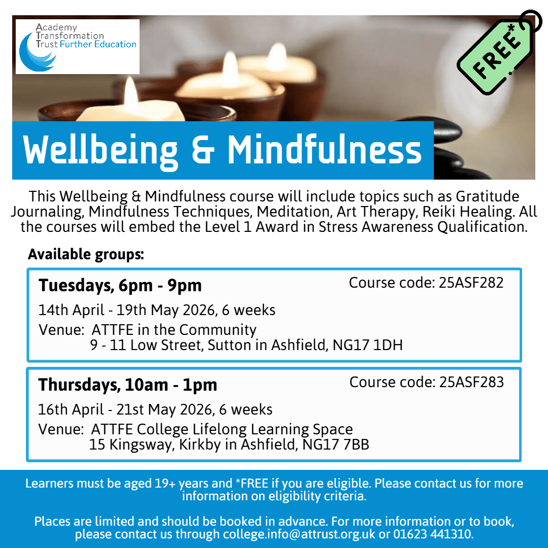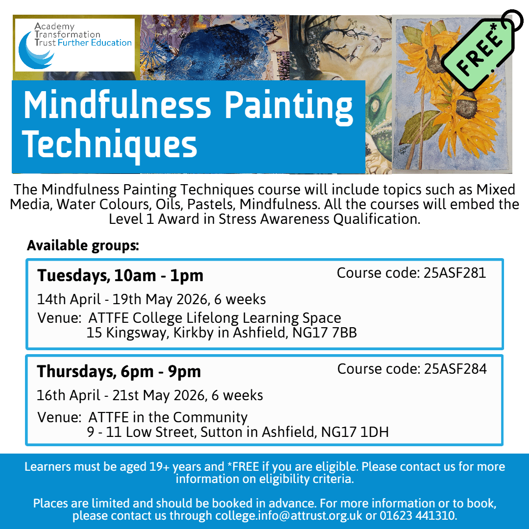 • Venue: ATTFE College Lifelong Learning Space, 15 Kingsway, Kirkby in Ashfield, NG17 7BB